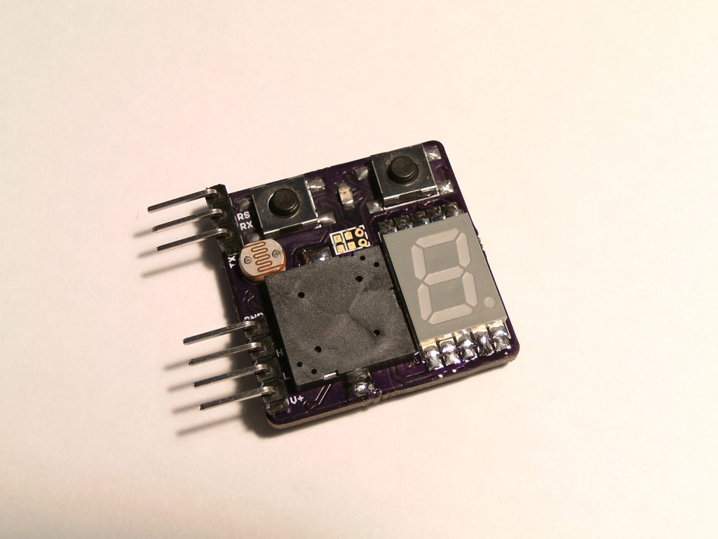 The Arduino platform and this MCP2515 library were used to code up the device. The alarm trigger point is set by revving the engine to the desired RPM and pressing the button on the right. The 7 segment display can cycle between displaying the selected gear, RPM to the nearest 1000 or nothing by pressing the left button. The display brightness is automatically adjusted with the help of an LDR.