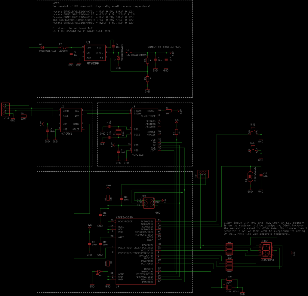 The rev alarm plugs into the vehicles OBD-II port, and contains an RT6200 buck regulator to drop the cars 12V down to around 5V, which is then used to power the ATmega328P microcontroller, MCP2515 CAN controller and MCP2561 CAN transceiver.