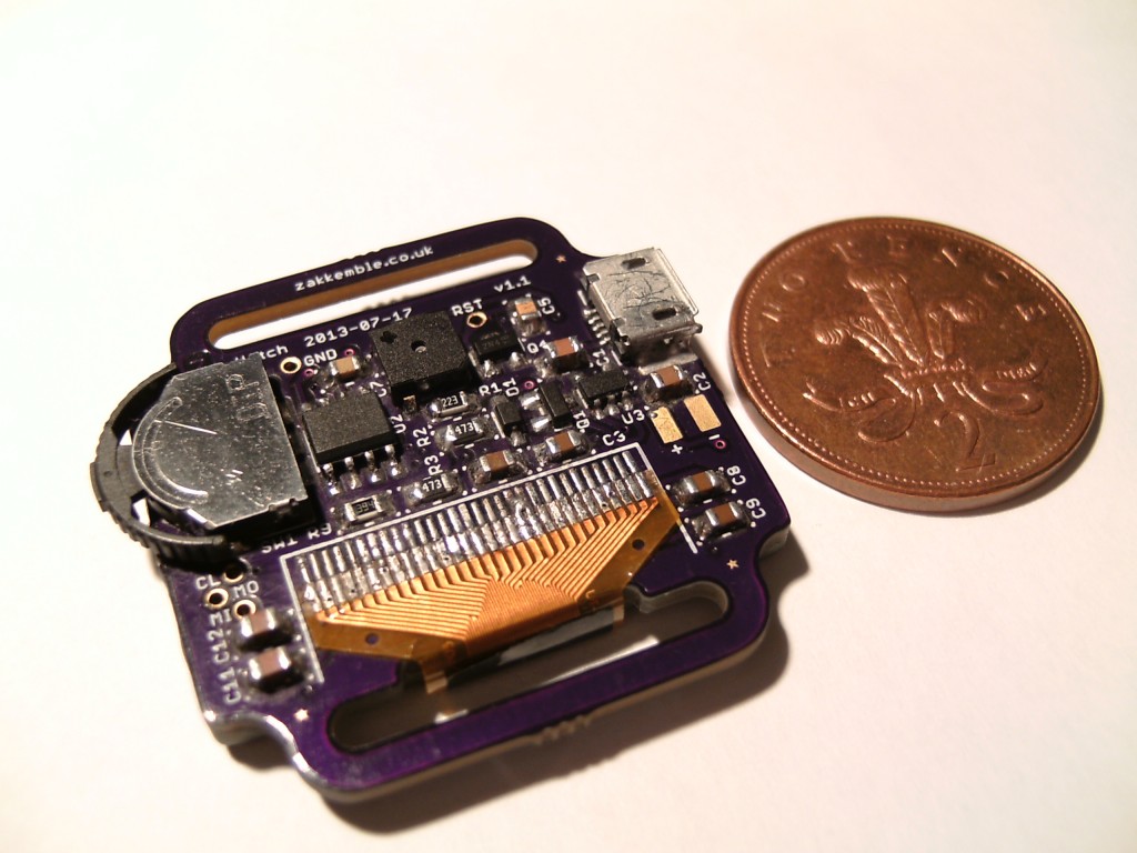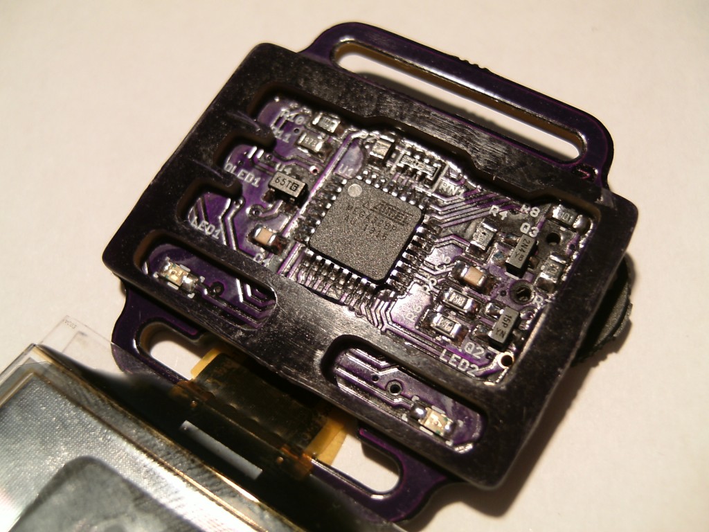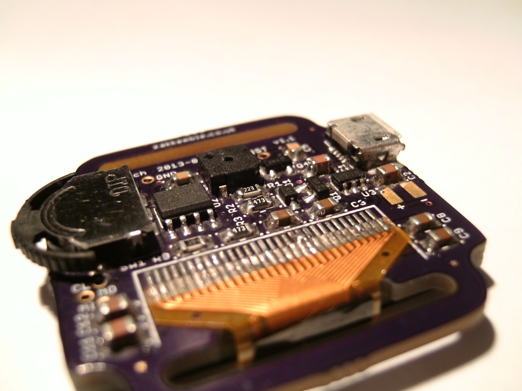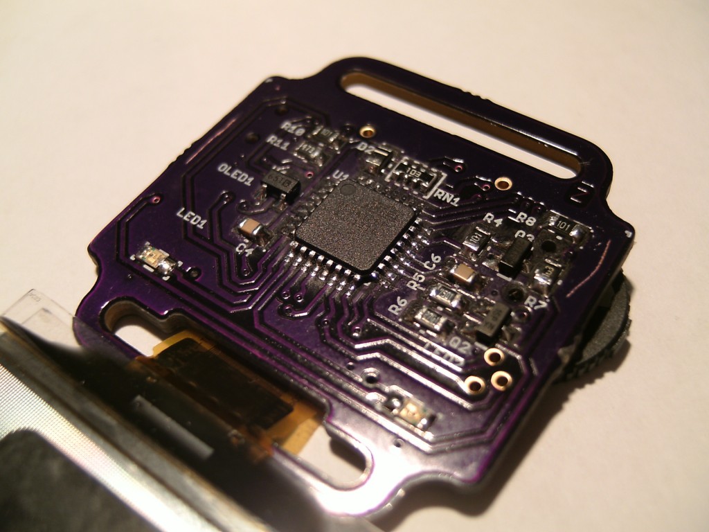 In ‘sleep’ mode the microcontroller turns the OLED off and goes into power-down sleep mode where it is only woken by either a button press, an RTC alarm or USB being plugged in. In this state the microcontroller draws ~100nA.